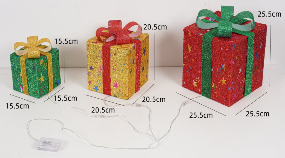 Each light up gift box is completely handmade. ✨ Shiny metal wires and glowing LED beads are wrapped around the surface of the gift box. Christmas lighted gift boxes contain 3 different sizes, all with different coloured bows! These lighted Christmas boxes are beautiful during the day and enchanting at night—I'm sure it will get compliments from your neighbors.